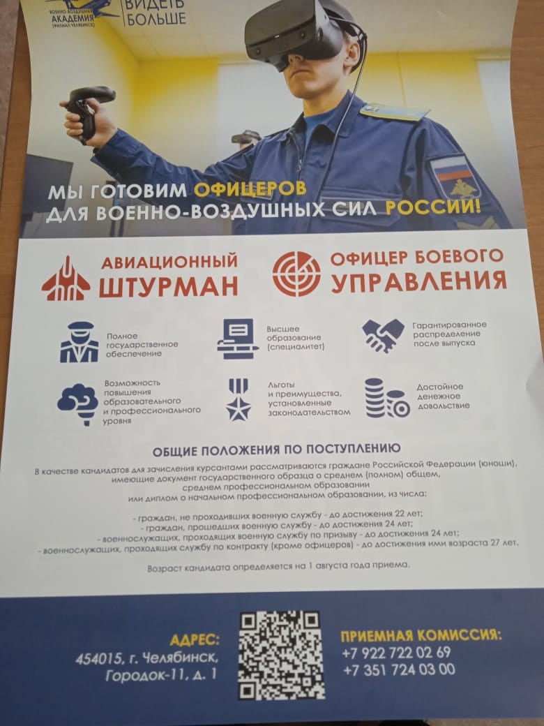 Федеральное государственное казённое военное образовательное учреждение высшего образования «Филиал Военного учебно-научного центра Военно-воздушных сил «Военно-воздушная академия имени профессора Н.Е. Жуковского и Ю.А. Гагарина» Министерства обороны Российской Федерации в г. Челябинске готовит офицеров для военно-воздушных сил России.
