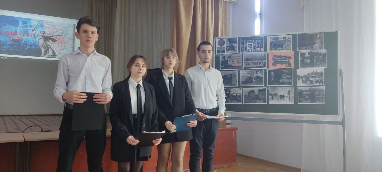 В этом году, 2 февраля, мы отмечаем 80 — летие со дня окончания Сталинградской битвы, ставшей переломным моментом в ходе Великой Отечественной войны и продемонстрировавшей всему миру несгибаемую силу духа, мужество и героизм советских войск. Ученики 10«А» класса рассказали о кровопролитной битве за Сталинград, о героях-защитниках Сталинграда, о мужестве и стойкости советских солдат, которые ценой собственной жизни одержали победу в этой страшной битве и стала переломным моментом в ходе Великой Отечественной войны. Присутствующие ребята посмотрели презентацию по теме, а также видеоматериалы.