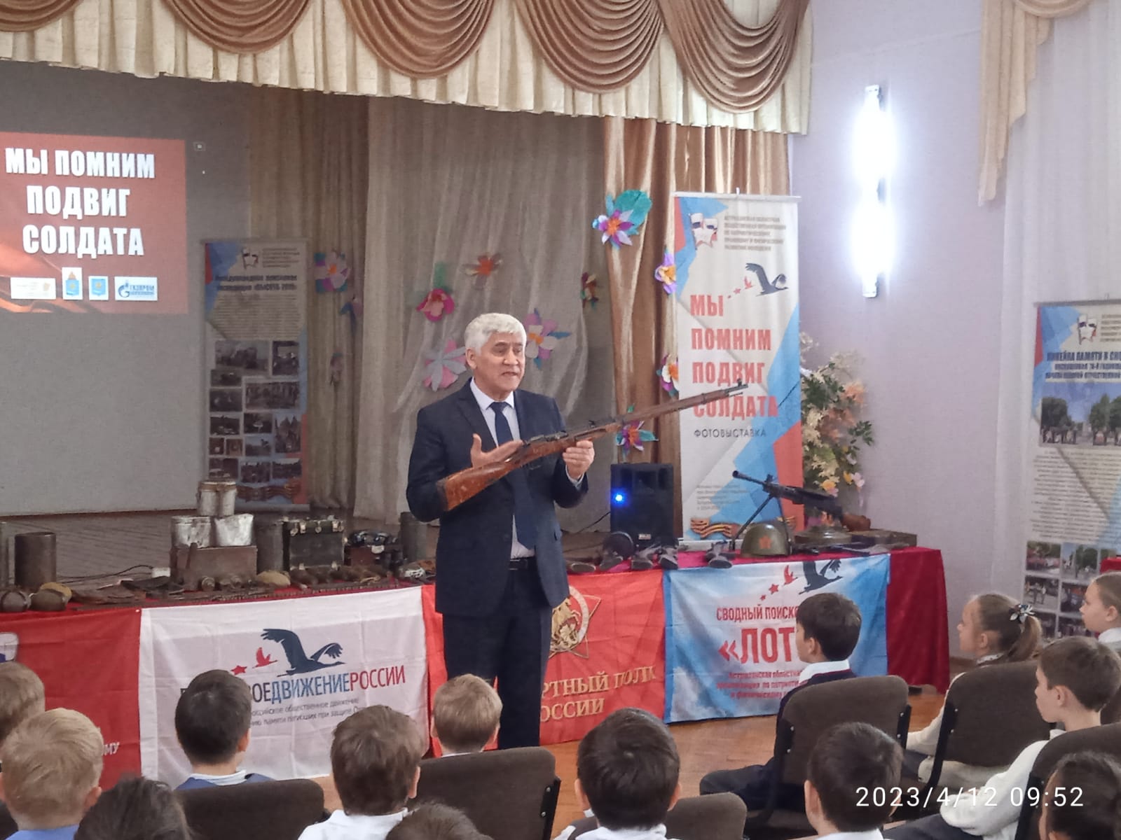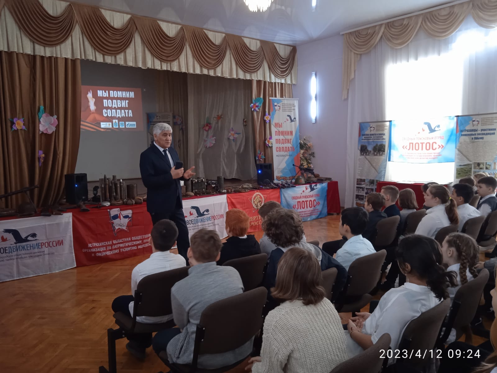 Сегодня 12.04.2023г. в школе прошли уроки Мужества, посвященные подвигам солдат, которые провел Александр Александрович Даиров – руководитель региональной общественной организации по патриотическому, правовому и физическому развитию молодежи, руководитель Астраханского сводного поискового отряда «Лотос».
