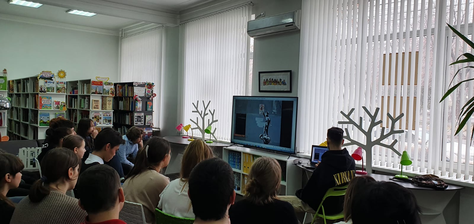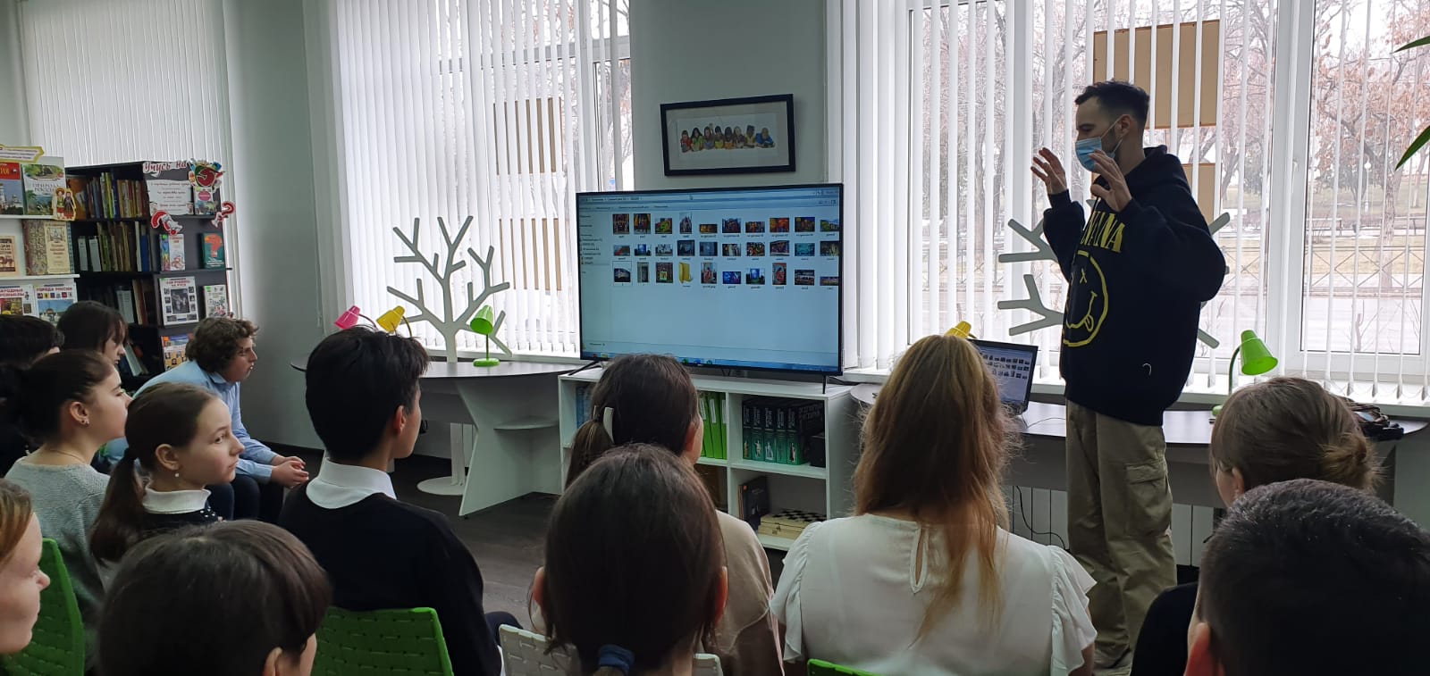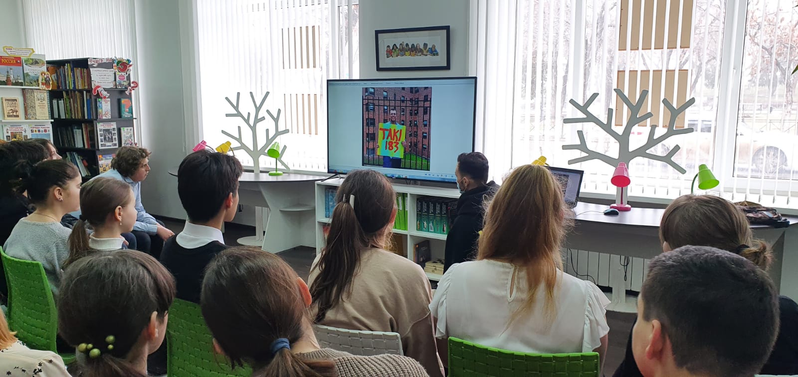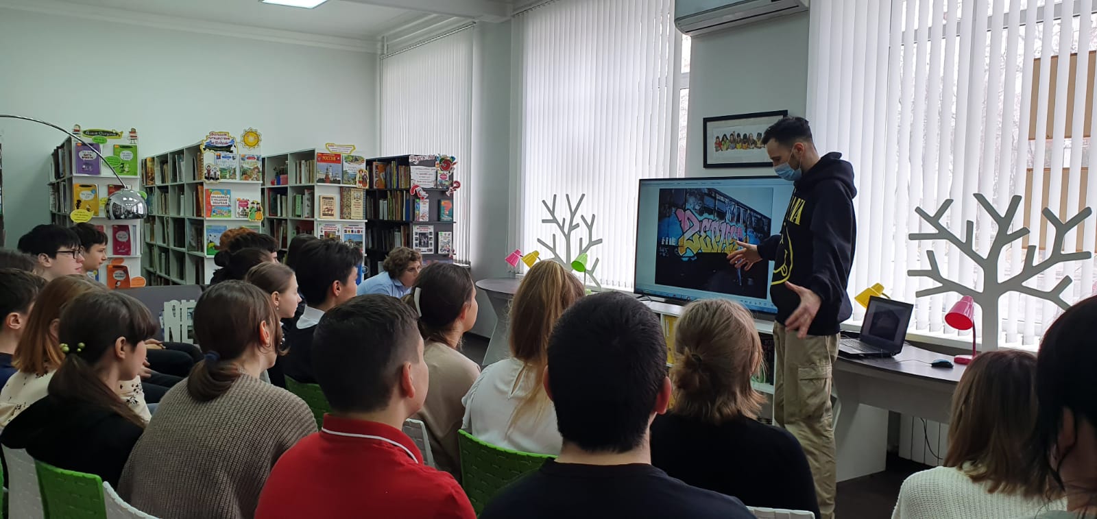 В отделе подросткового чтения Областной детской библиотеки для учащихся 9 «А» и 9 «В» классов состоялся час искусства «Обсуждаем стрит-арт», и на встречу со школьниками пришел один из первых граффити-художников нашего города Максим Мазим. Он познакомил подростков с такими видами стрит-арта, как постеры, трафареты, муралы, скульптурные инсталляции и, конечно же, граффити.