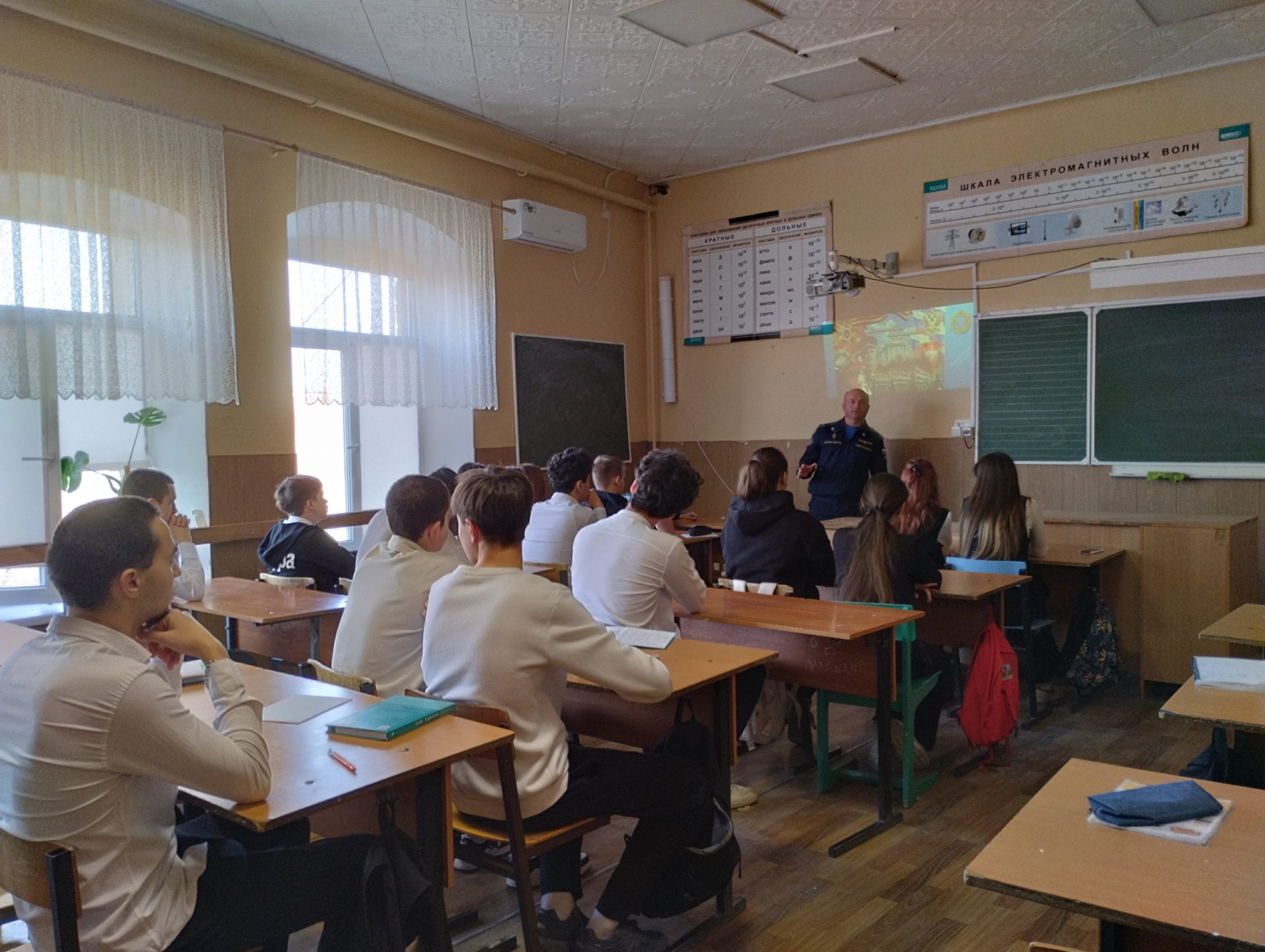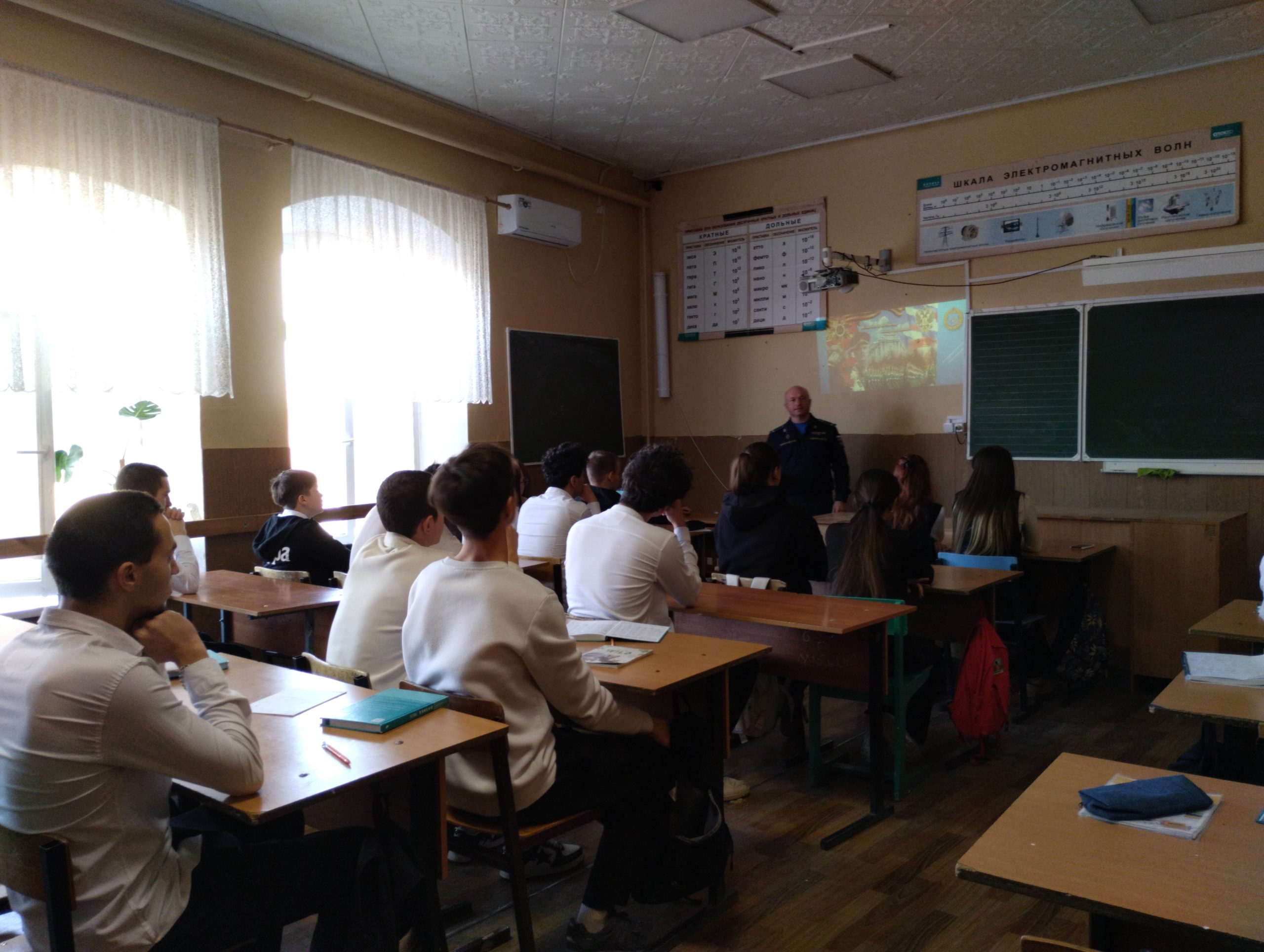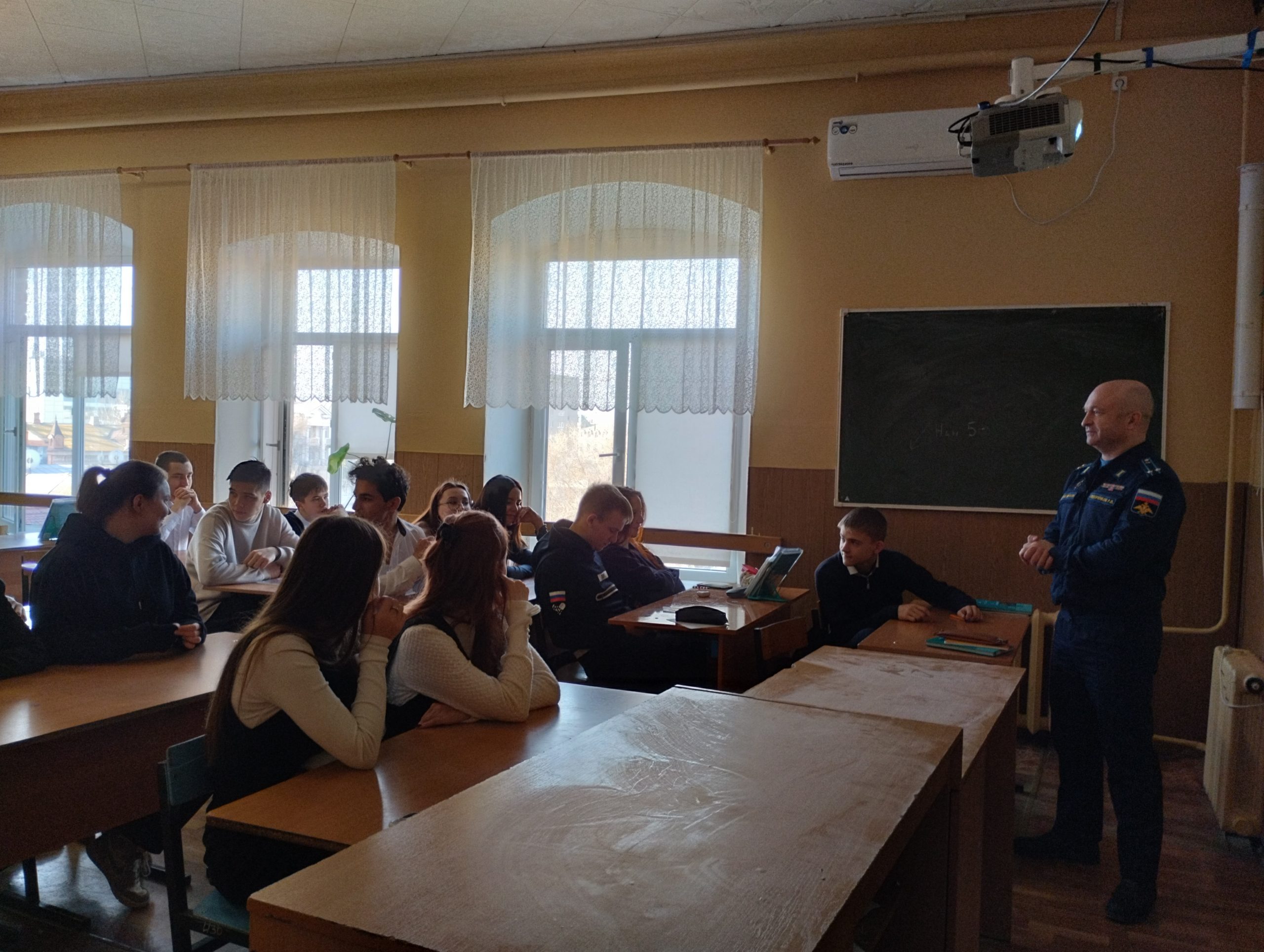 В рамках Всероссийской акции «Есть такая профессия — Родину защищать!» подполковник Сидоренко подробно рассказал ученикам 10 и 11 классов о службе в ВСРФ и о военных вузах.